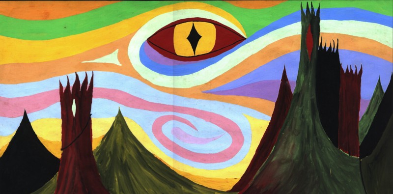 A dust jacket design for The Two Towers. On the left we have Isengard with it's spiral stair. On the right we should have Minas Morgul*, but it is actually closer to the description of Cirith Ungol.