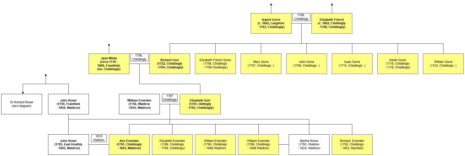In 1706 Isaac Gurre of Laughton married local girl, Elizabeth French. The couple had eight children, one pre-marital but all baptised in Chiddingly. Their second youngest child, Richard married Jane White in Chiddingly but all his children were baptised in Hellingly, though Richard and his wife were buried in Chiddingly. Richard's daughter Elizabeth married William Evenden in Chiddingly in 1787 and the couple had four children before Elizabeth died in 1795. Chiddingly parish had made several attempts to "remove" William, Elizabeth and their children back to William's home parish of Waldron and by 1801 William was back home. His daughter, Ann Evenden, married John Roser in Waldron in 1810.