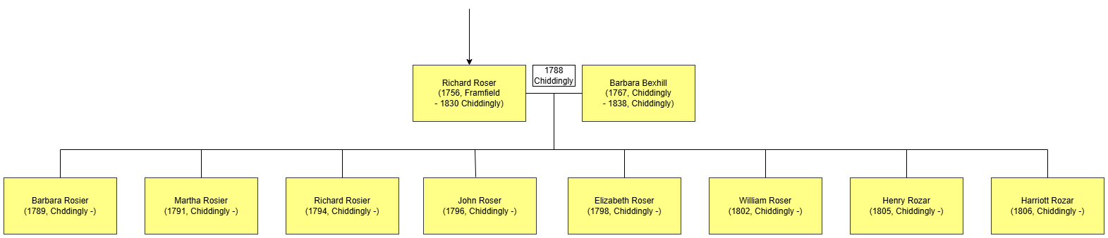 There is a further connection to Chiddingly via Ann's husband John Roser. John's Uncle Richard (born in Framfield) moved to Chiddingly and, in 1788, married local girl, Barbara Bexhill and the couple baptised eight children in the parish church.