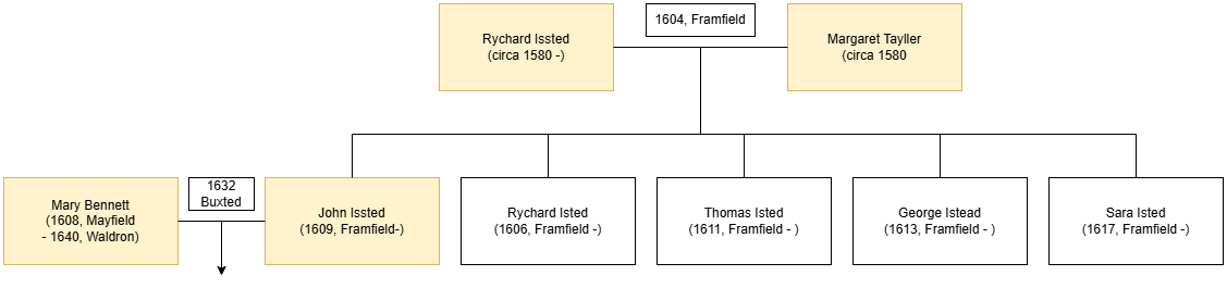 The great-great-grandfather of Thomas Isted who married Mary Wilding in Little Horsted in 1756 was John Issted (1609). John and his four siblings (the offspring of Rychard Issted and Margaret Tayller) were all baptised in Framfield between 1606 and 1617.