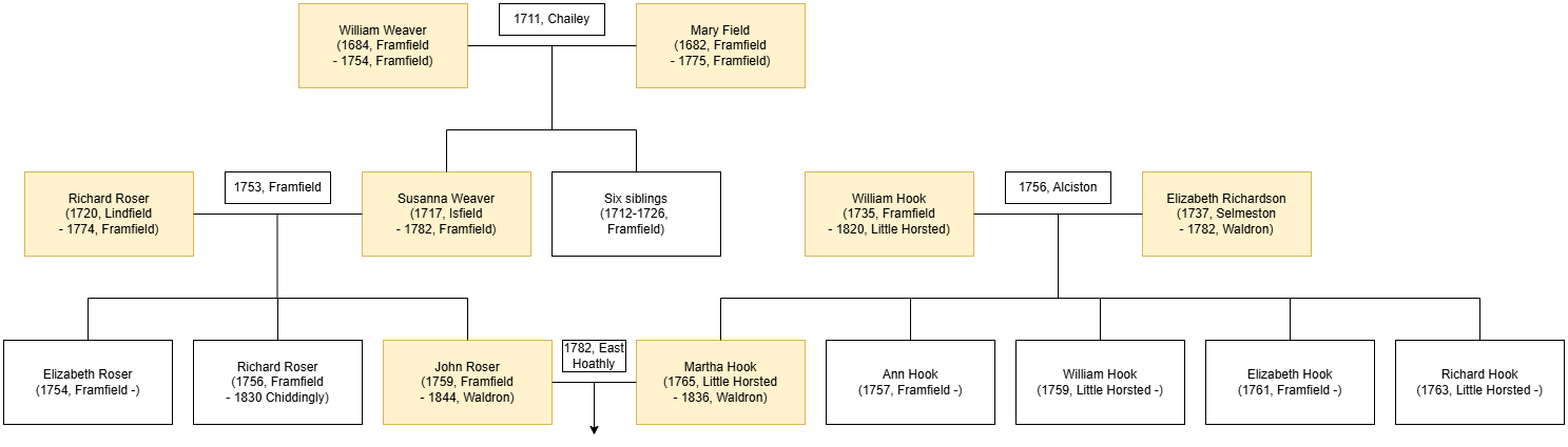 William Hook was born in Framfield and married Elizabeth Richardson in Alciston in 1756. Their first child was baptised in Framfield in 1757, but in 1758 William, Elizabeth and their infant daughter were removed to Little Horsted by the Parish of Framfield and their next child, William, was born in Little Horsted. Their third child Elizabeth was born back in Framfield, but the couple were back in Little Horsted for the birth of their last two children, the last being my 5th great-grandmother Martha Hook (baptised 26 May 1765). Martha married John Roser on 28 Oct 1782 in East Hoathly. John and his two siblings (Elizabeth and Richard) were all baptised in Framfield between 1754 and 1759, the offspring of Richard Roser of Lindfield and Susanna Weaver. Susanna was baptised in Isfield but her six siblings were baptised in Framfield. Her parents were William Weaver and Mary Field, both natives of Framfield.