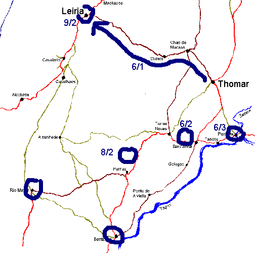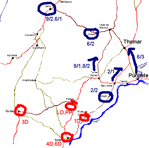 The French are now concentrated along the Leiria-Thomar road with the bulk of the troops (6 out of the 8 divisions) clustered towards the Thomar end. To Wellinton it looks as though they are headed mainly towards Espinhal and he makes his dispostions accordingly.
