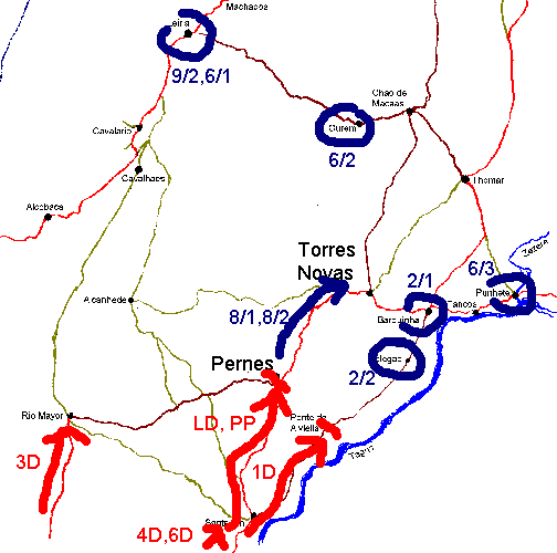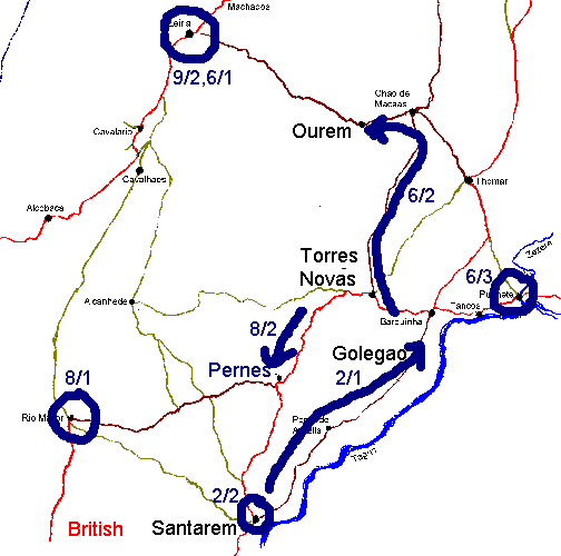 | 5-6 Mar | Overnight Clausel (8C/1) pulls back from Rio Mayor and joins Solignac (8C/2) at Pernes whileHeudelet (2C/2) pulls back from Santarem destroying the bridge at Ponte de Alviella as he goes. The French are now much safer, with no one left exposed without supports. |