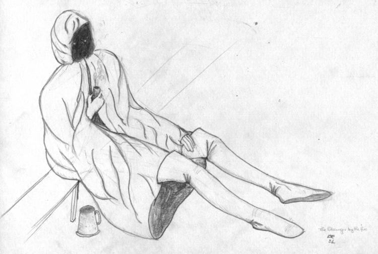 Suddenly Frodo noticed that a strange-looking weather-beaten man, sitting in the shadows near the wall, was also listening intently to the hobbit-talk. He had a tall tankard in front of him, and was smoking a long stemmed pipe curiously carved. His legs were stretched out before him, showing high boots of supple leather that fitted him well, but had seen much wear and were now caked with mud. A travel-stained cloak of heavy dark-green cloth was drawn close about him, and in spite of the heat of the room he wore a hood that overshadowed his face; but the gleam of his eyes could be seen as he watched the hobbits.