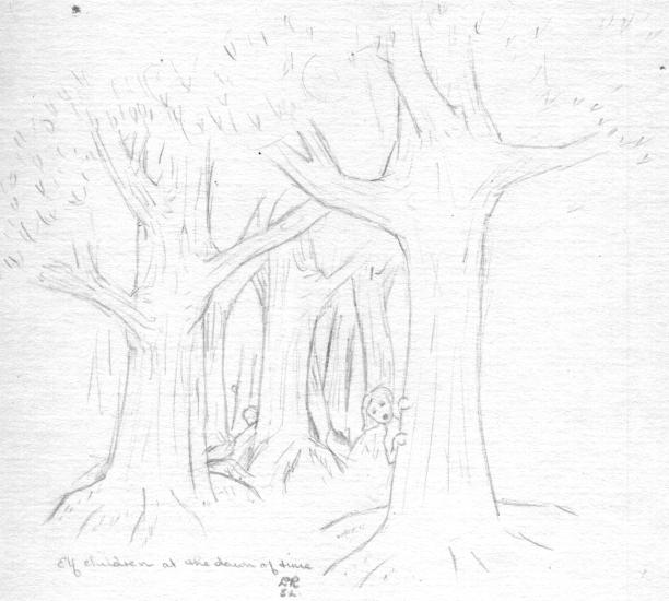 He led the way in under the huge branches of the trees. Old beyond guessing, they seemed. Great trailing beards of lichen hung from them, blowing and swaying in the breeze. Out of the shadows the hobbits peeped, gazing back down the slope: little furtive figures that in the dim light looked like elf-children in the deeps of time peering out of the Wild Wood in wonder at their first Dawn.