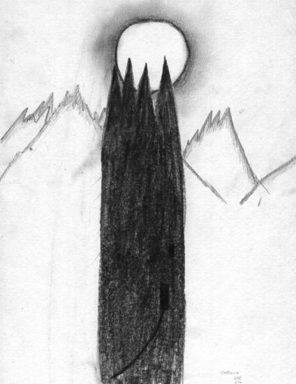Frodo's DreamIn the dead night, Frodo lay in a dream without light. Then he saw the young moon rising; under its thin light there loomed before him a black wall of rock, pierced by a dark arch like a great gate. It seemed to Frodo that he was lifted up, and passing over he saw that the rock-wall was a circle of hills, and that within it was a plain, and in the midst of the plain stood a pinnacle of stone, like a vast tower but not made by hands.