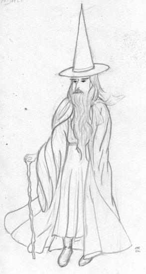 Gandalf from The HobbitAll the unsuspecting Bilbo saw that morning was an old man with a staff. He had a tall pointed blue hat, a long grey cloak, a silver scarf over which his long white beard hung down below his waist, and immense black boots.