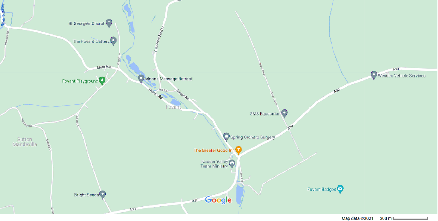 This map shows the village of Fovant and its surroundings. High Street runs from the A30 near "The Greater Good Inn" and splits to form Tisbury Rd and Dinton Rd. There is a lookout for the Fovant Badges on the A30, about 600 m east of the High St intersection. The brook through the village follows the line of springs.