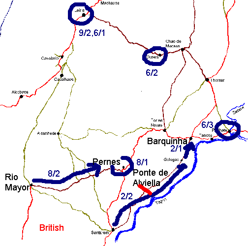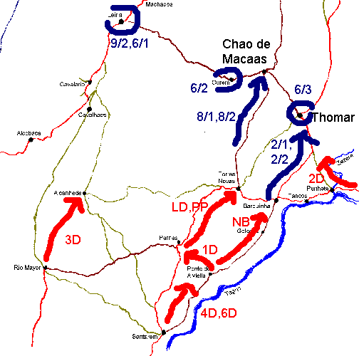 The French are now concentrated along the Leiria-Thomar road with the bulk of the troops (6 out of the 8 divisions) clustered towards the Thomar end. To Wellinton it looks as though they are headed mainly towards Espinhal and he makes his dispostions accordingly.